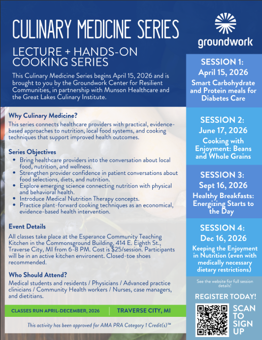 Groundwork Center for Resilient Communities, Munson Healthcare, and Great Lakes Culinary Institute at Northwestern Michigan College are hosting the Farms, Food & Health, Culinary Medicine Trainings in 2026, in Traverse City, Michigan.